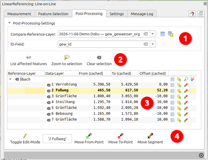 "PostProcessing" allows the combination of Data-Layer with an alternative reference-layer-version (must have same geometry-type, projection, reference-ids as reference-layer). As result all records are with affected linear referenced geometries are listed.